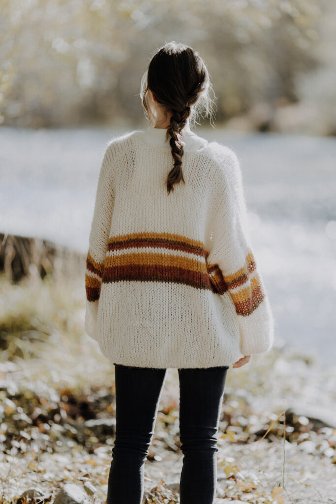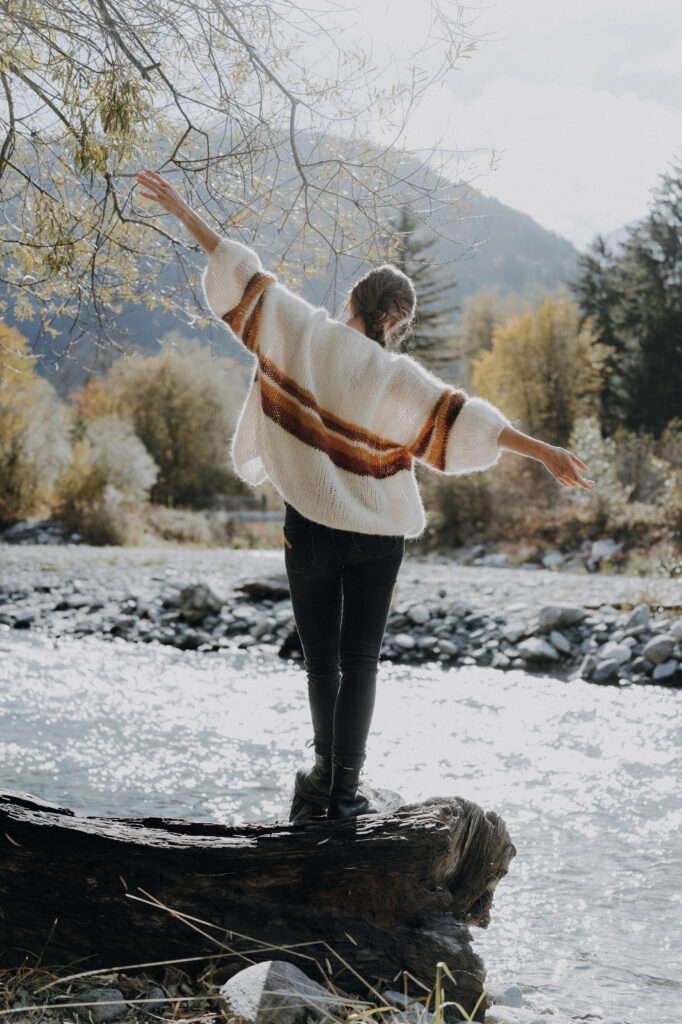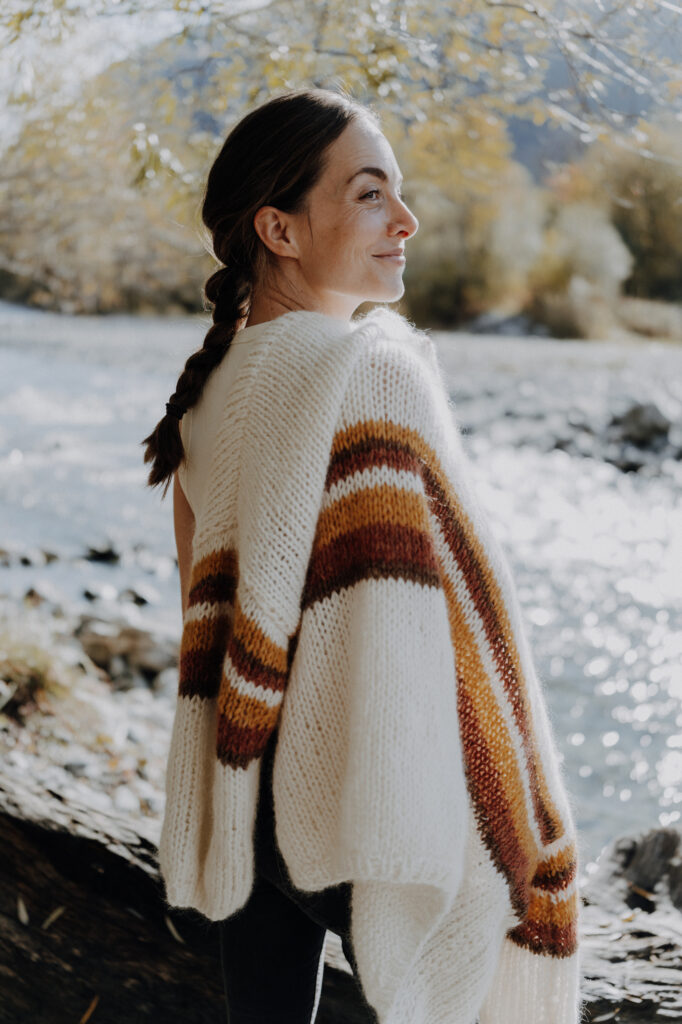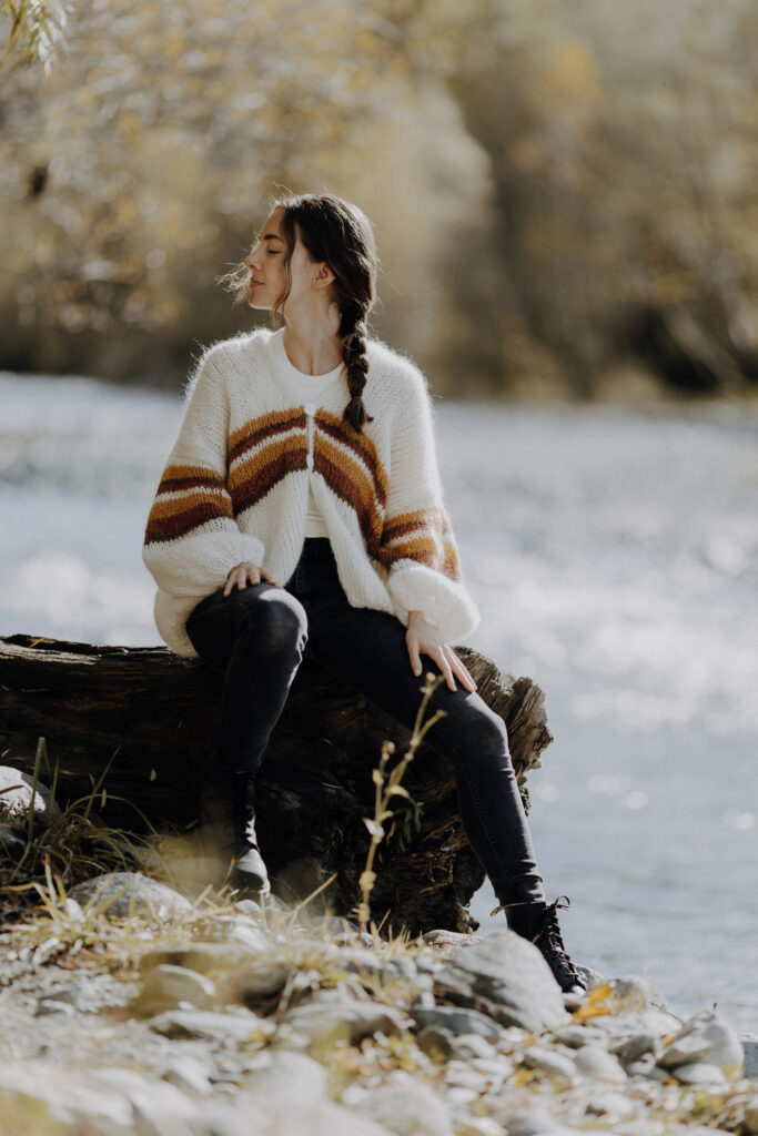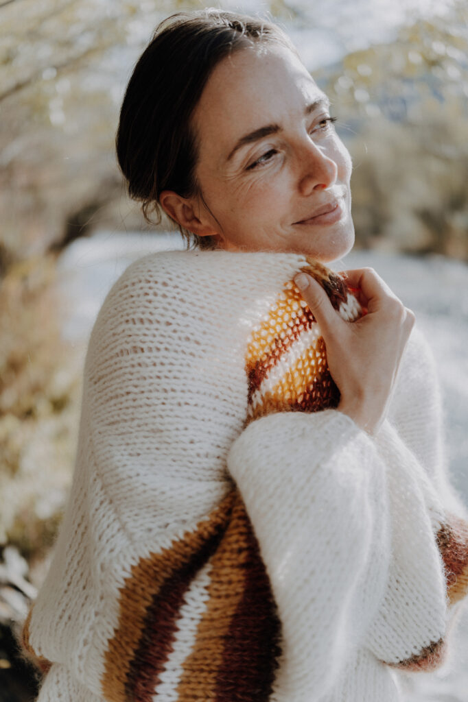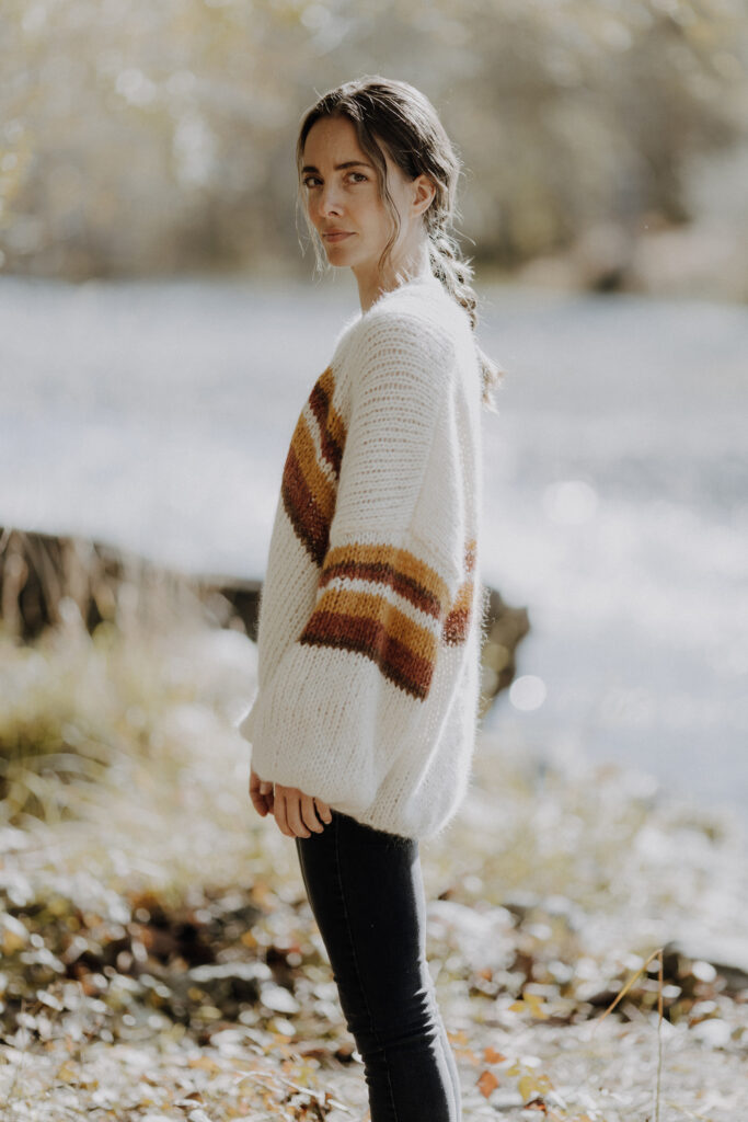 Ob die sanften Grüntöne, die an weiches Flussgras erinnern oder die warmen Streifen, die wie Sonnenstrahlen durch die Bäume leuchten – beide Cardigans erwecken dieses „Ich bleib noch ein wenig draußen“-Gefühl. Die handgestrickten Herbst-Modelle umhüllen dich wie eine kuschelige Umarmung an klaren Tagen am Fluss, bei Spaziergängen über moosige Wege oder kleinen Auszeiten im Garten. Doch auch in den Großstadtdschungel zaubern die natürlichen Farbtöne und die flauschig-warmen Materialien einen erdigen Touch. Jede Masche trägt ein bisschen Ruhe in sich – und ein Stück Natur, das du auf deiner Haut spüren kannst.